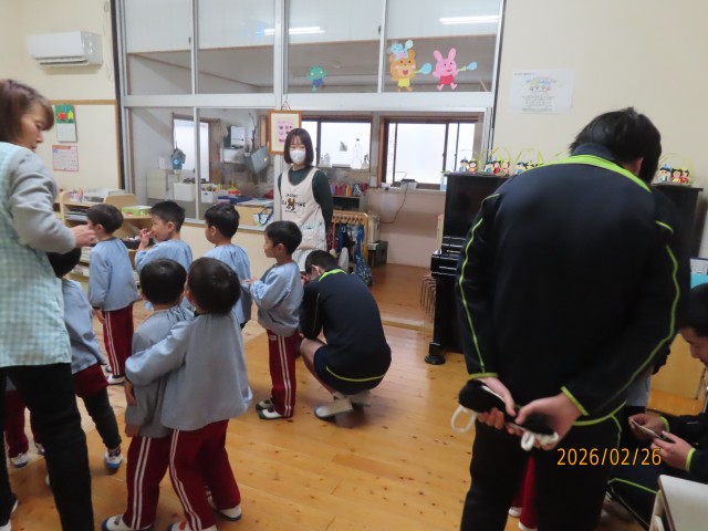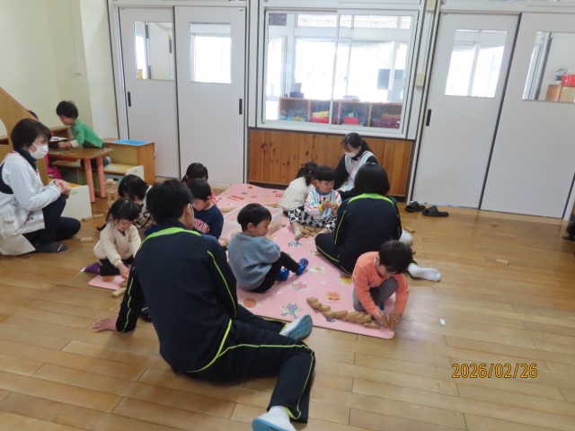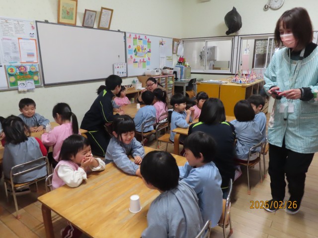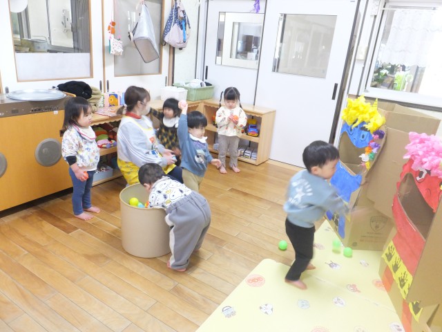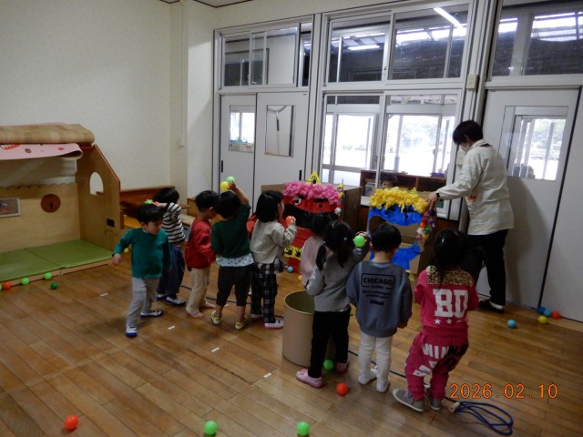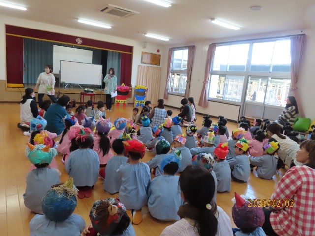 124年ぶりの2月2日の節分でしたが、3日に節分の集いを行いました。大きいクラスと小さいクラスで分かれて、お話や歌、ゲームなどを行いました。