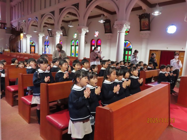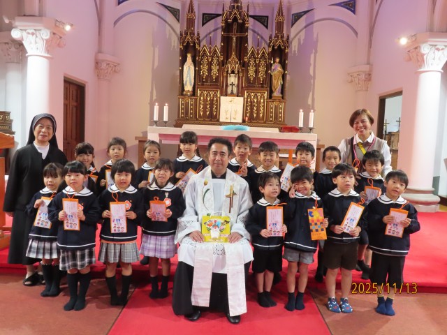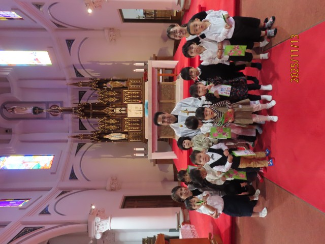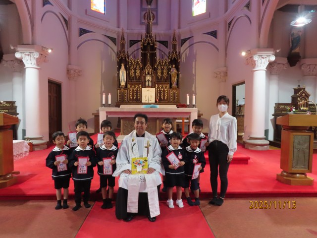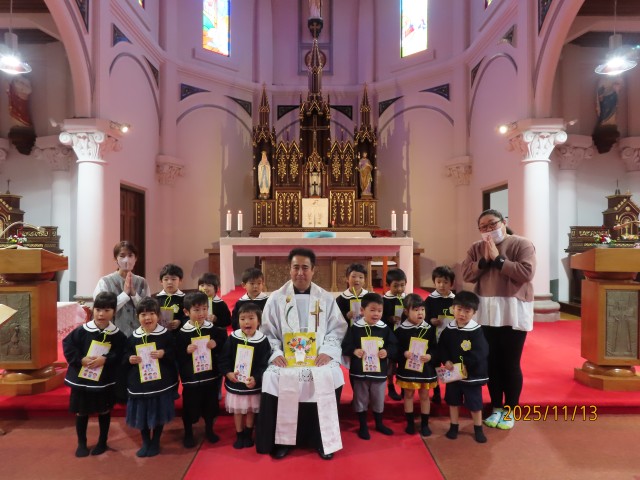11月13日に753のお祝いをしました。良いお天気に恵まれ、紐差教会へ行き、神父様に七五三の祝福をしていただきました。お祈りや共同祈願を唱え、歌を歌い神父様のお話を聞きました。祝福された千歳飴を頂き子ども達はとても嬉しそうにしていました。これからも優しく思いやりのある子どもに成長できるようにお祈りしてます。