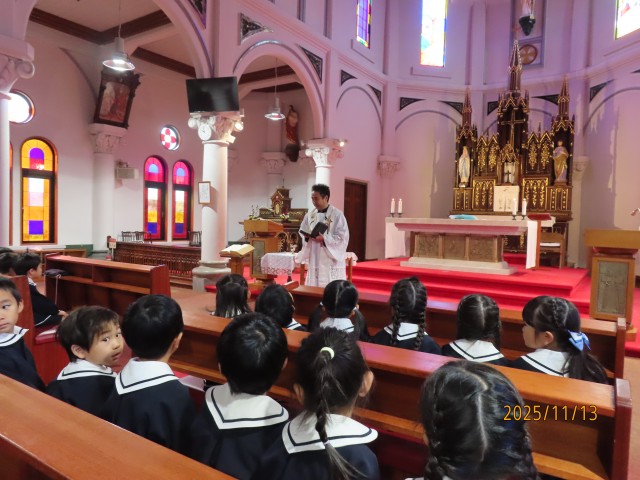 鶴崎神父様が、「自分にできることをすることが、相手(お家の方や周り方を喜ばせる)プレゼントですよ」と子ども達にわかりやすくお話してくださいました。