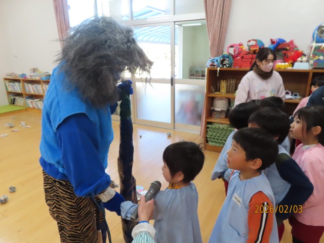 集会では節分の由来を聞いたり、歌を歌ったり、鬼のお面の制作の紹介をしました。みんなの前で難しかったところや工夫したところなどを発表してくれました。その後に鬼が登場し、「鬼は外、福は内」と言いながら新聞豆を投げて心の中にいる悪い鬼を追い出しました。