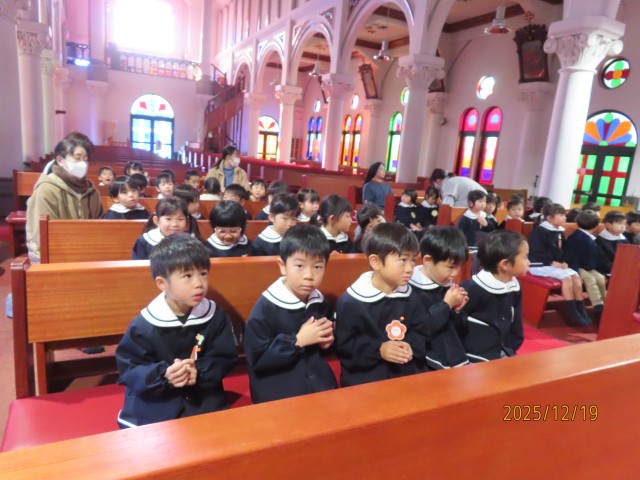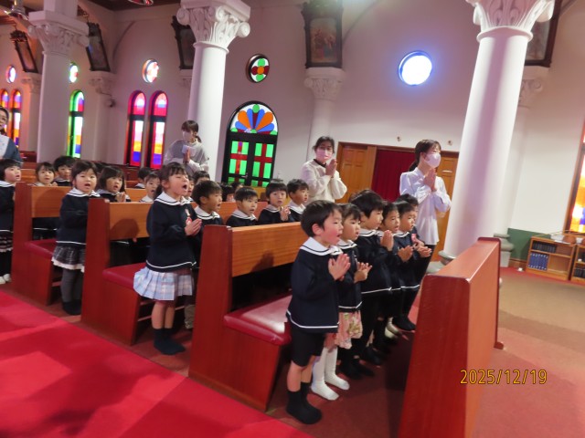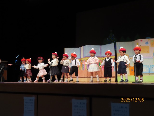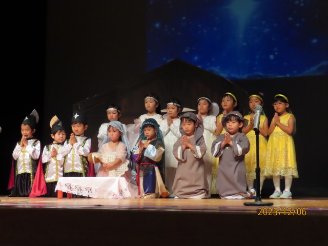 赤ちゃんイエス様のお誕生日をお祝いするために、年長さんは聖劇をしました。セリフもたくさん覚え、大きな声で発表することができました。各クラス、お遊戯やオペレッタ、合奏(リズムあそび)フィンガータップを頑張りました。これからもイエス様、マリア様の見守りの中でいろんなことに挑戦したり、お友だちに優しくしたりして元気に大きく成長しますように!