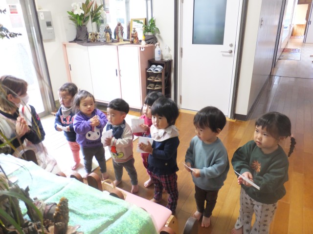 11月13日に753のお祝いをしました。良いお天気に恵まれ、紐差教会へ行き、神父様に七五三の祝福をしていただきました。お祈りや共同祈願を唱え、歌を歌い神父様のお話を聞きました。祝福された千歳飴を頂き子ども達はとても嬉しそうにしていました。これからも優しく思いやりのある子どもに成長できるようにお祈りしてます。